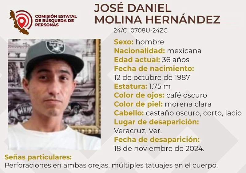 Finalmente se reportó, la desaparición de José Daniel Molina Hernández de 36 años, de quien no se sabe nada de él desde el pasado 18 de noviembre.