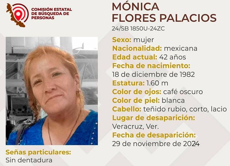 En una ficha de búsqueda se informa de la desaparición de Mónica Flores Palacios de 42 años, quien desapareció el pasado 29 de noviembre.