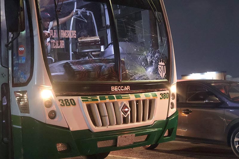El parabrisas de la unidad Saeta Verde, marca Beecar acabó estrellado y el peatón tirado con algunos golpes.