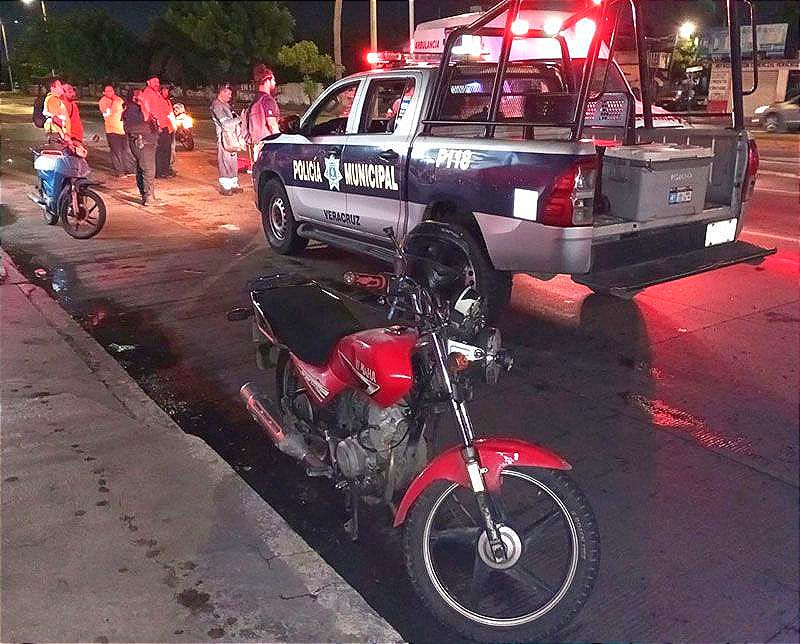 En calles de la colonia Playa Linda en la ciudad de Veracruz, una pareja en motocicleta sufrió un accidente al regresar por la madrugada de la jornada laboral, movilizándose personal de emergencias y preventivos.