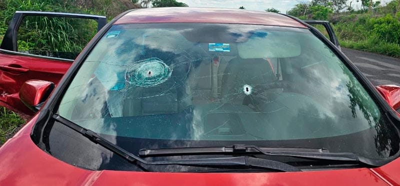 La camioneta presenta dos orificios de bala en el parabrisas, está golpeada del lado del copiloto, y se presume que sus ocupantes huyeron con rumbo desconocido.