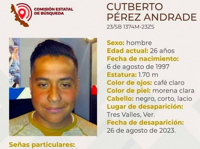 La ficha 23/SB 1374M-23ZS reporta la desaparición de Cutberto Pérez Andrade, de 26 años de edad, con quien se perdió contacto el pasado 26 de agosto de 2023 en Tres Valles, Veracruz.