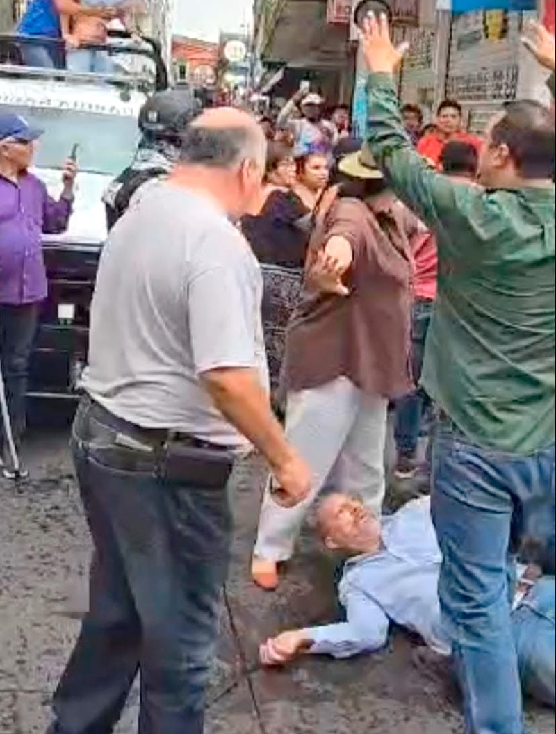 *De inmediato hubo empujones y golpes entre civiles y uniformados, durante la riña detuvieron a dos locatarios pero uno de ellos le dio un infarto cuando era llevado a los separos