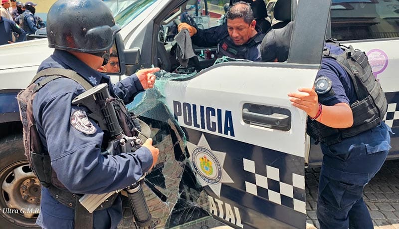 La violencia se desató nuevamente instantes después, pues los locatarios se enfrentaron a golpes contra policías y descalabraron a un elemento de la SSP, además causaron daños a una patrulla, el lesionado fue llevado al hospital.