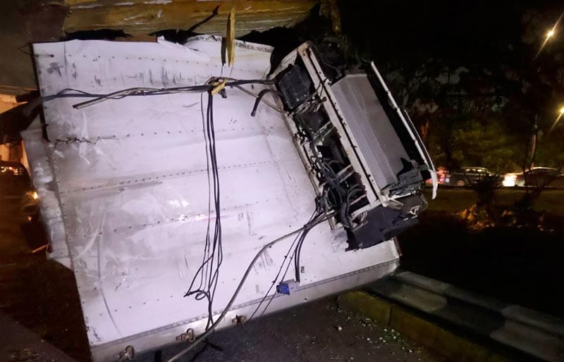 A la altura del distribuidor vial de la Cabeza Olmeca, un tráiler que iba a incorporarse a la avenida Miguel Alemán, habría presentado una falla mecánica que provocó el desprendimiento de su caja refrigerante, misma que su chófer dejó tirada en plena curva.