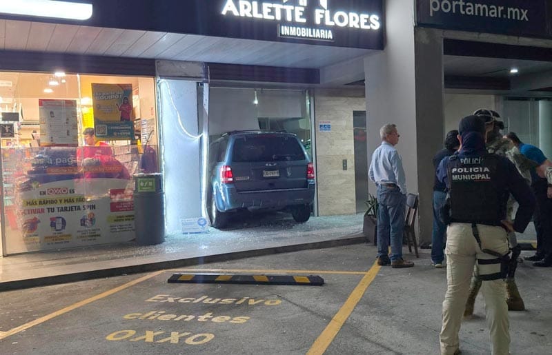 Se brincó un pequeño tope, luego la banqueta y chocó contra la fachada de cristal de una inmobiliaria, causando daños materiales cuantiosos, sin heridos, pues no había personas ya.