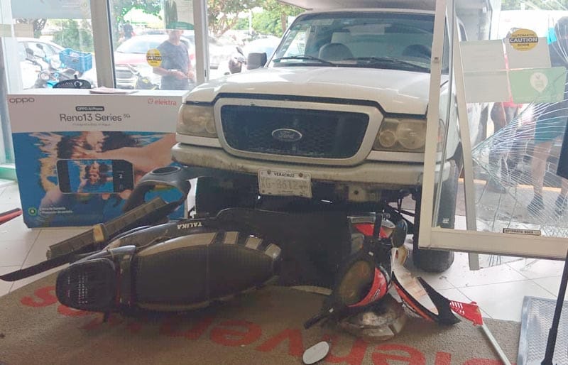 Gran movilización se registró la tarde de este domingo en el fraccionamiento Puente Moreno, luego de que una camioneta de carga se estrellara contra la fachada de una tienda Elektra y terminara dentro del inmueble, generando pánico entre empleados y clientes.