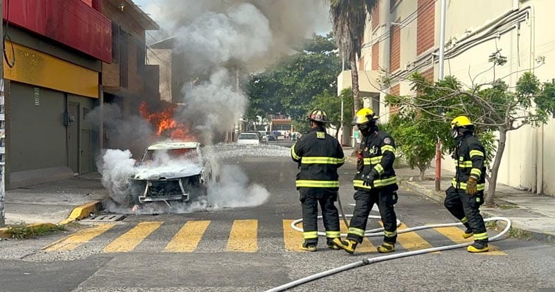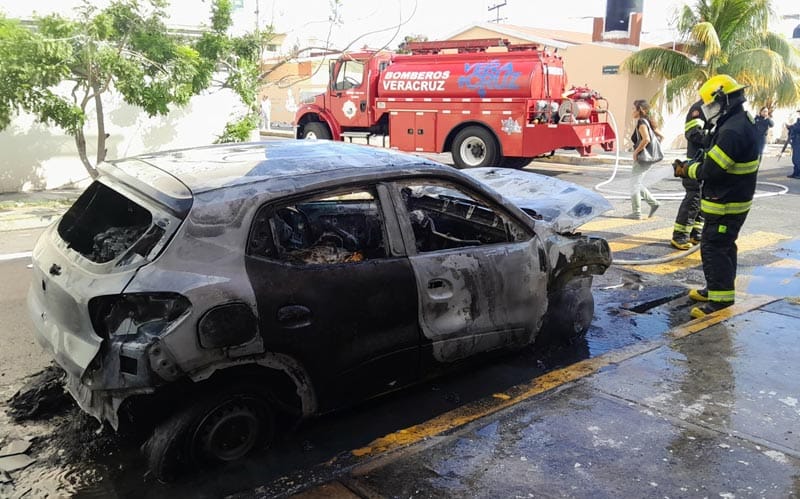 En calles del fraccionamiento Vista Mar, junto a la UDICA Veracruz, un carro marca Renault, de color blanco, se incendió en su totalidad, dañado las llamas y el calor la fachada de una tienda Oxxo y cables de media tensión.