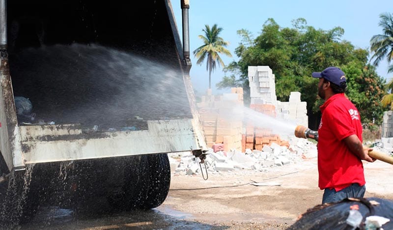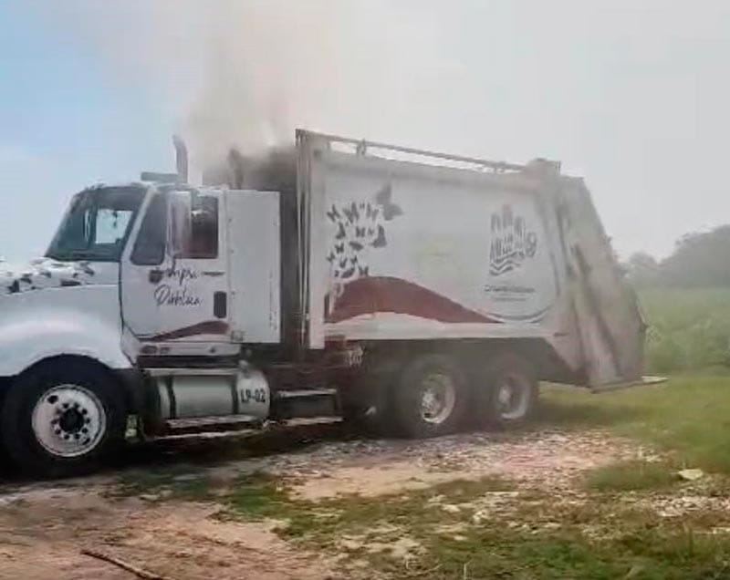 Rápidamente procedieron a bajarse de la carretera federal, cerca de la colonia San Felipe, hacia una zona segura para descargar los residuos de basura en llamas, los cuales ya le comenzaban a provocar daños al camión compactador.