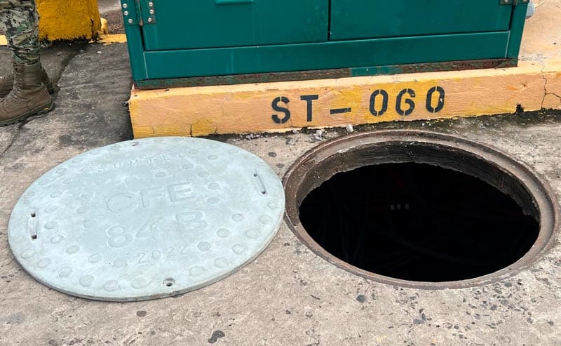 El hombre caminaba por la banqueta cuando pisó una tapa floja y cayó al fondo del registro a unos tres metros de profundidad, quedando entre cables de alta tensión y con agua hasta las rodillas.