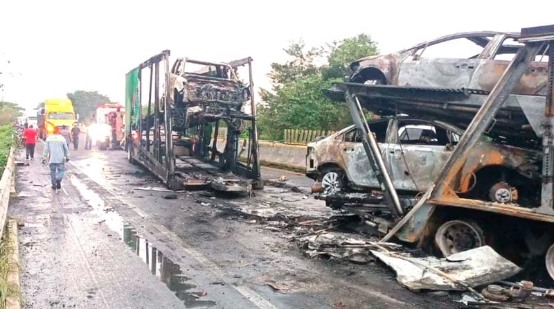 Diez automóviles nuevos quedaron convertidos en chatarra en un choque e incendio ocurrido el viernes sobre autopista Tinaja-Cosoleacaque, en tramo Isla-Acayucan, donde un tractocamión nodriza chocó por alcance contra un tractocamión Freightliner.