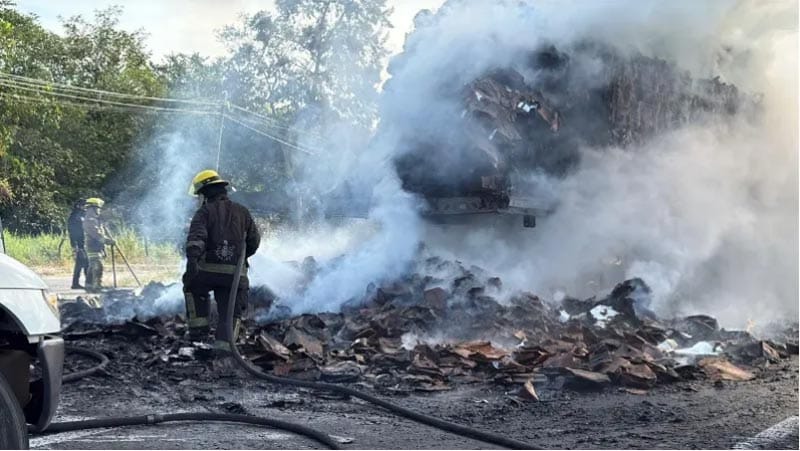 Un tractocamión cargado con pacas de papel de desecho se incendió cuando circulaba sobre carretera federal 140D Xalapa-Veracruz, a la altura de Corral Falso del municipio de Emiliano Zapata, obligando al cierre de la circulación vehicular.