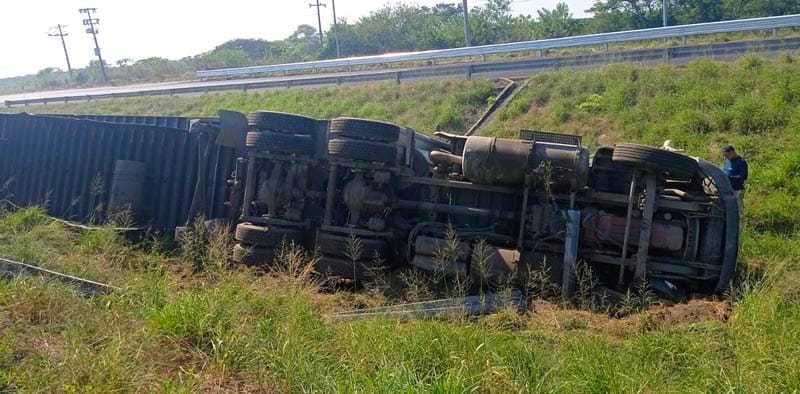 El vehículo pesado perdió el control, volcando sobre la cuneta central, causando daños materiales significativos en la unidad. Afortunadamente, el chofer salió ileso.
