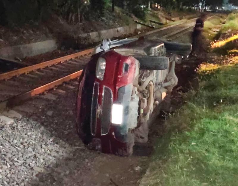 Ahí iba circulando una camioneta, de la marca Chevrolet, de batea con camper, fue localizada volcada a escasos metros de las vías del tren, lo que representó un riesgo en caso de que una locomotora transitara por el lugar en esos momentos.