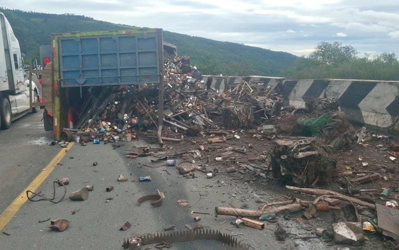 Entonces, al llegar a una curva, entre la Plaza de Cobro 027 y los túneles de La Esperanza, el operador no pudo controlarlo y volcó sobre costado derecho, quedando la chatarra regada sobre el asfalto.