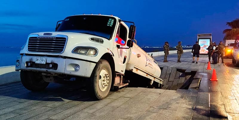 La mañana de este jueves, una pipa del Ayuntamiento de Boca del Río cayó en un socavón que se abrió repentinamente en el Boulevard Manuel Ávila Camacho, a la altura del “Penacho del Indio” en el fraccionamiento Costa de Oro.