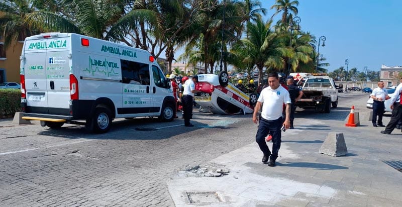 La tarde de este jueves, un automóvil Nissan March en modalidad taxi, con número económico VB-1917, volcó en la calle Marina Mercante, a un costado del puente Morelos y frente a las instalaciones de la Administración Portuaria.