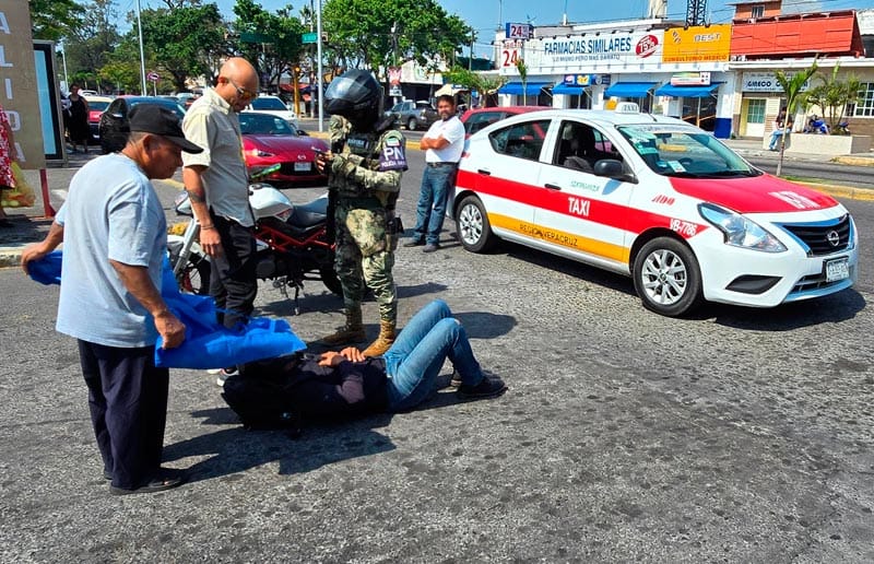 A decir del taxista, de nombre Jerónimo C.Y., aparentemente iba disminuyendo la velocidad, casi metiéndose al estacionamiento del Soriana, cuando a la altura de Alcocer, el motociclista lo rebasó por la derecha, dándose la colisión.
