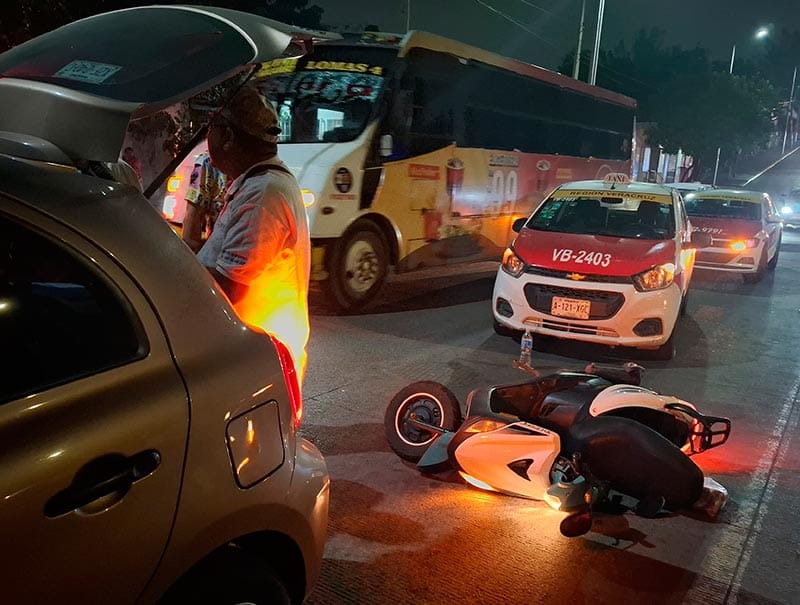 En la zona de la unidad habitacional de Rio Medio, al norte de la ciudad de Veracruz hubo un percance vial entre un taxi y los ocupantes de una motoneta que acabaron golpeados por el impacto.