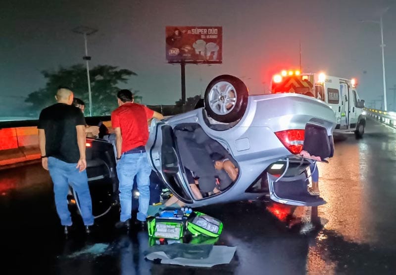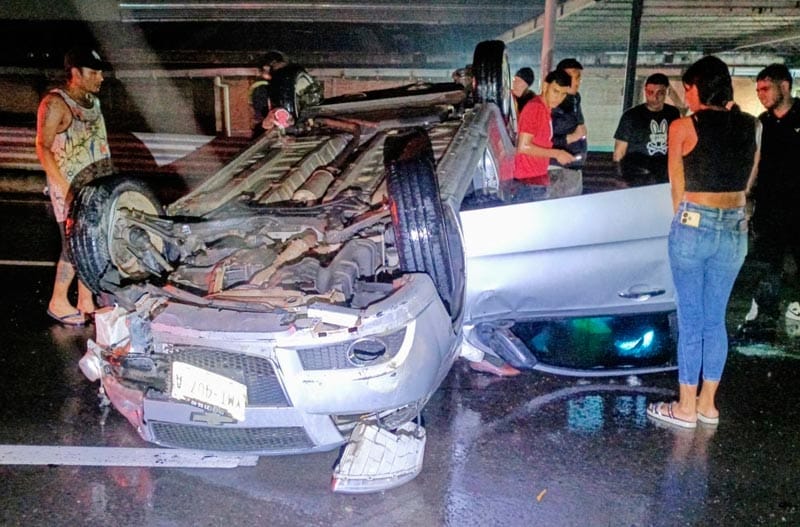 Ahí iba a gran velocidad un automóvil, marca Chevrolet, tipo Aveo, de color gris, cuyo operador perdió el control por la velocidad y el pavimento mojado, pegando contra un pilar de concreto divisor del puente, generando que se volcara la unidad, y quedara con las llamas hacia arriba.