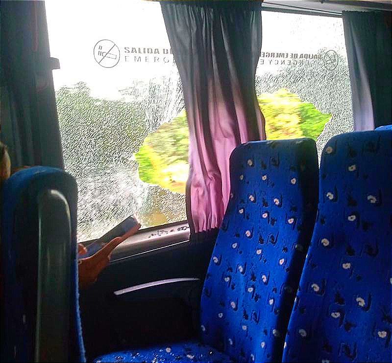 Metros adelante los pasajeros escucharon al menos dos detonaciones de arma de fuego, uno de los proyectiles perforó el parabrisas del autobús y otro se impactó en el cristal de una ventanilla.