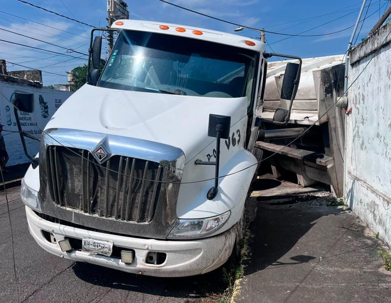 De acuerdo con testigos, cuando el operador levantó la parte trasera del camión para vaciar el material, una falla mecánica ocasionó que la tolva se soltara y se inclinara peligrosamente hacia un costado, derribando el portón de la vivienda, parte de la barda, un poste de madera con cables de telefonía e internet, así como parte de la fachada de un vecino.