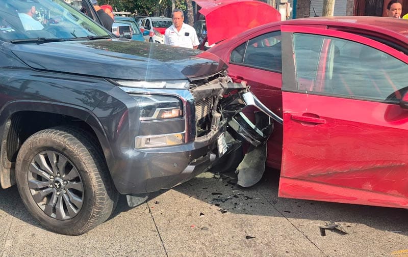 En calles del Centro Histórico, en la ciudad de Veracruz, hubo un fuerte accidente entre una camioneta Mitsubishi y un carro Chevrolet Sonic, dejando severos daños materiales y la presencia de personal de vialidad.