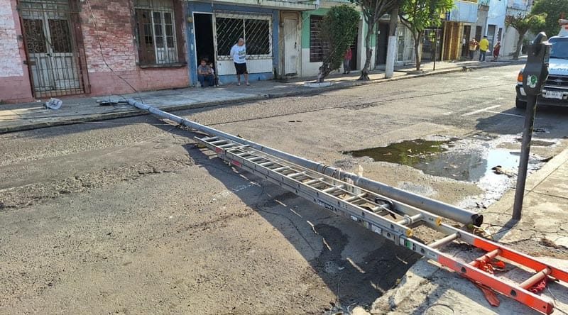 En céntricas calles de la ciudad de Veracruz, un trabajador de Telmex terminó cayendo de un poste de alumbrado público, por lo que fue atendido por paramédico de la Cruz Roja.