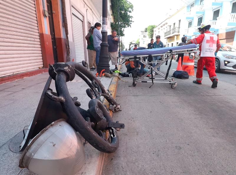 En la zona del Centro Histórico de Veracruz, un trabajador cayó desde una altura aproximada de cuatro metros, recibiendo en el suelo el golpe de un farol que estaban rehabilitando.