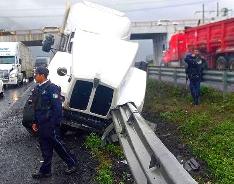El conductor del tráiler marca Kenworth Kenmex de color blanco, con número económico 31, con razón social "Transportes Paredes", con placas del SPF y que remolcaba un semiremolque tipo plana cargada con láminas, perdió el alineamiento del camino debido al exceso de velocidad en que viajaba, derrapó, se salió de la carpeta de rodamiento y se incrustó contra la barra metálica del acotamiento central.