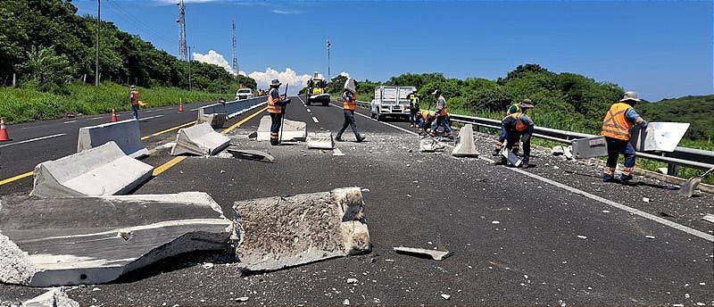 Al punto se trasladaron elementos de Auxilio Vial para acordonar y retirar los bloques de concreto que fueron esparcidos por el impacto del tráiler.
