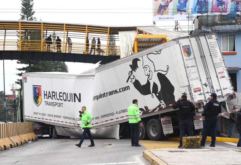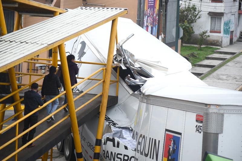El semirremolque se incrustó en la estructura metálica del puente peatonal y provocó que prácticamente se partiera la caja seca, quedando al descubierto la carga consistente en cajas de productos lácteos (La Lechera).