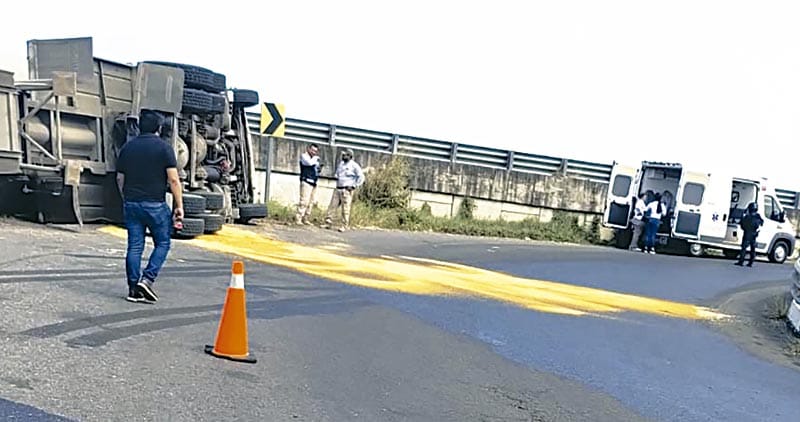 Un tractocamión de la empresa Bachoco con varias toneladas de alimento, volcó en el puente de la localidad de Paso del Toro en el municipio de Medellín de Bravo, generando la presencia de los cuerpos de emergencia.