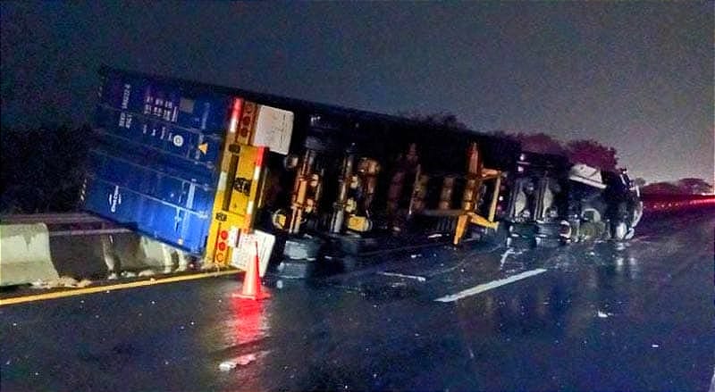 En la autopista Cardel-Veracruz en las inmediaciones de la localidad de San Julián, en la zona norte del municipio de Veracruz, un tractocamión que transportaba un contenedor terminó volcando tras subirse a la rampa de una "nodriza" que estaba orillada en pleno camino.