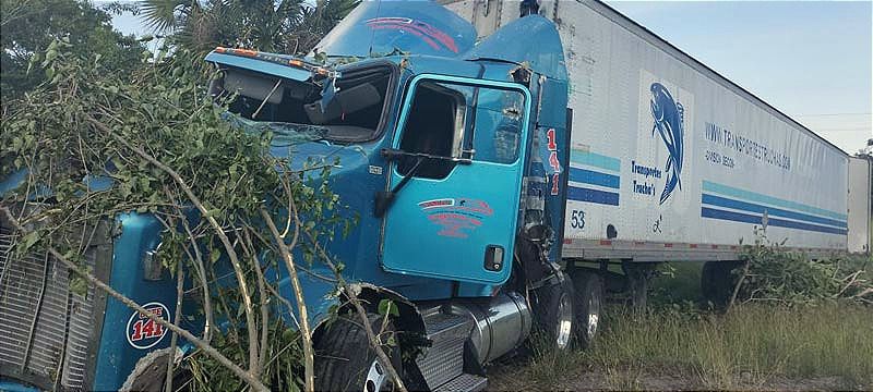 El tráiler cabina azul tipo International quedó fuera de la carpeta asfáltica en un predio junto con la caja metálica ya que el chofer se había dado a la fuga.