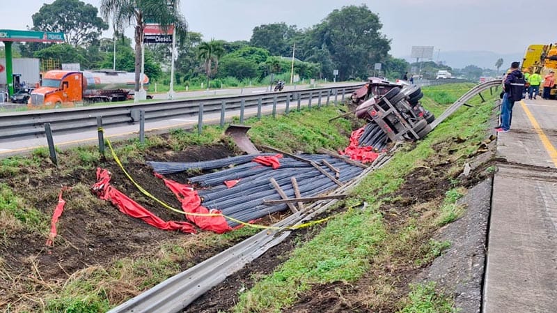 Acudió una patrulla de la policía estatal y oficiales constataron que, volcado sobre la cuneta que divide ambos carriles de la autopista, estaba un tráiler de marca Kenworth con doble semirremolque plataforma cargado con varilla y el operador prensado en la cabina.