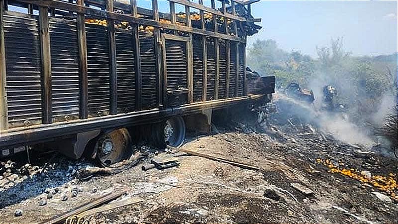 Al invadir carril contrario, el tráiler chocó de frente contra un camión Torton cargado con naranjas, unidad que tras la colisión se empezó a incendiar y toda la fruta quedó regada sobre el asfalto.