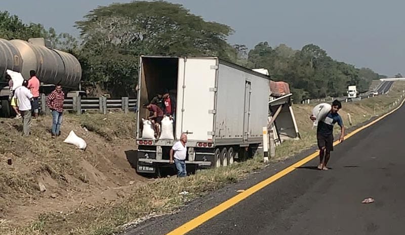 Aunque la cabina quedó en posición horizontal, la caja del tráiler permaneció estable, mientras la respuesta de las autoridades fue tardía, permitiendo a los habitantes de las comunidades cercanas apropiarse del azúcar antes de la llegada de las autoridades.