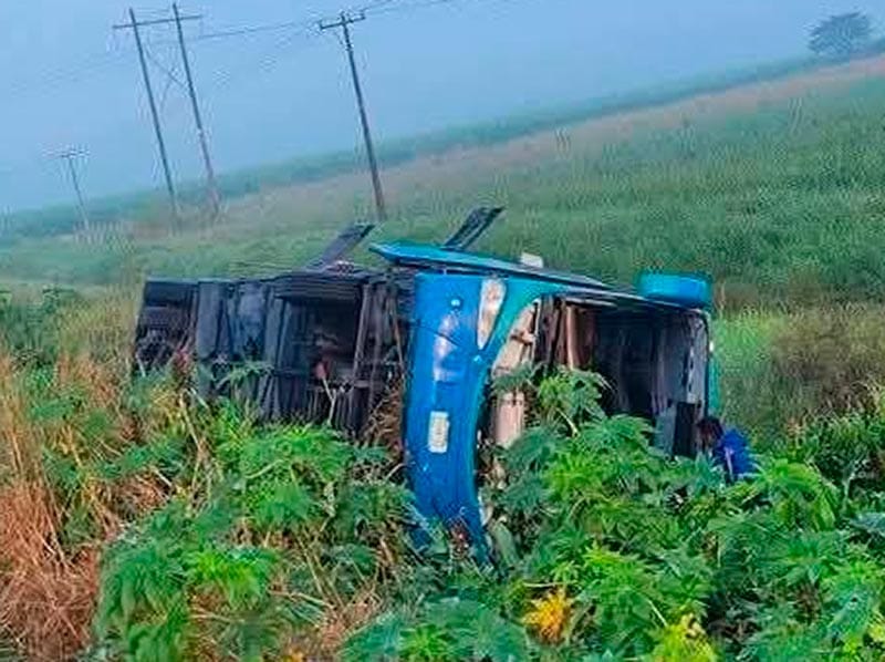Al quedar sin control, el autobús salió del camino y volcó sobre costado izquierdo, quedando entre la maleza a unos 12 metros de la carpeta asfáltica, los pasajeros despertaron aterrados, unos diez con golpes contusos, por fortuna nadie grave.