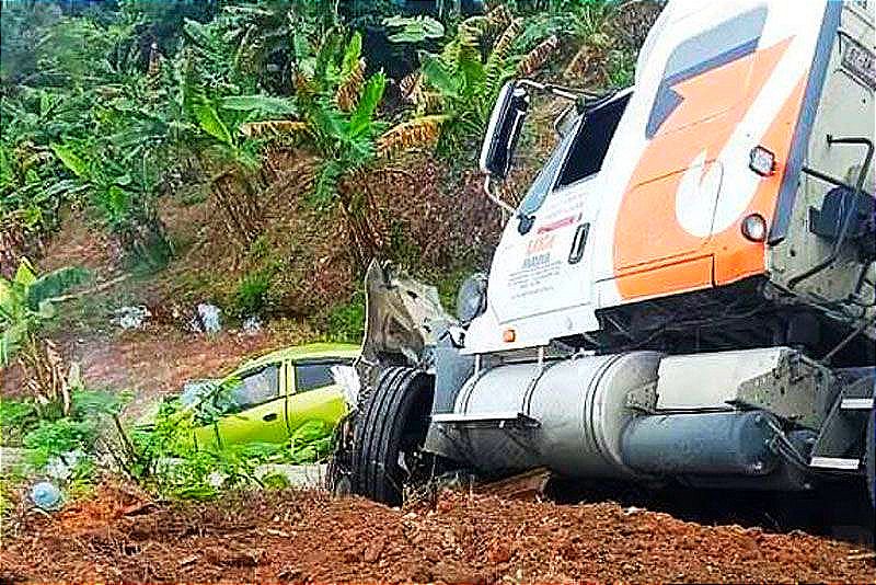 El operador del tractocamión perdió el control también y, al despistar, quedó varado en una especie de ladera, con daños severos en el cofre del tráiler, sin lesiones.