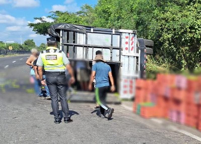 Después de una hora y media la carga fue apilada en cajas a orilla de la pista, en espera que otro camión la recogiera, en tanto una grúa arribó para rescate del torton siniestrado.