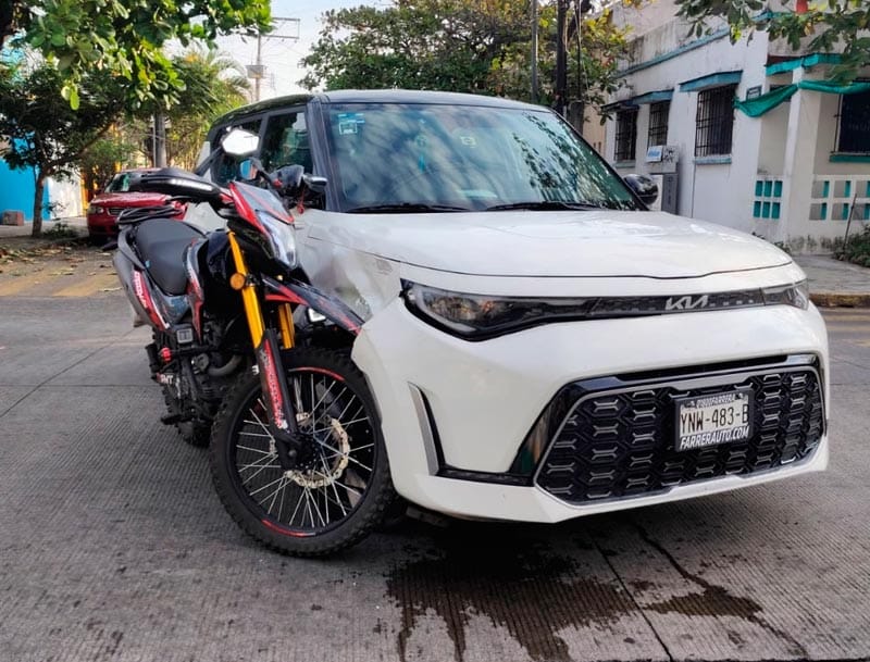 En la calle Agustín Iturbide iba Ramiro H. E., en un automóvil, marca Kia, tipo Soul de color blanco, quien al cruzar lo hizo sin observar a Jiren R. V., a bordo de una motocicleta marca Vento Pro 250.