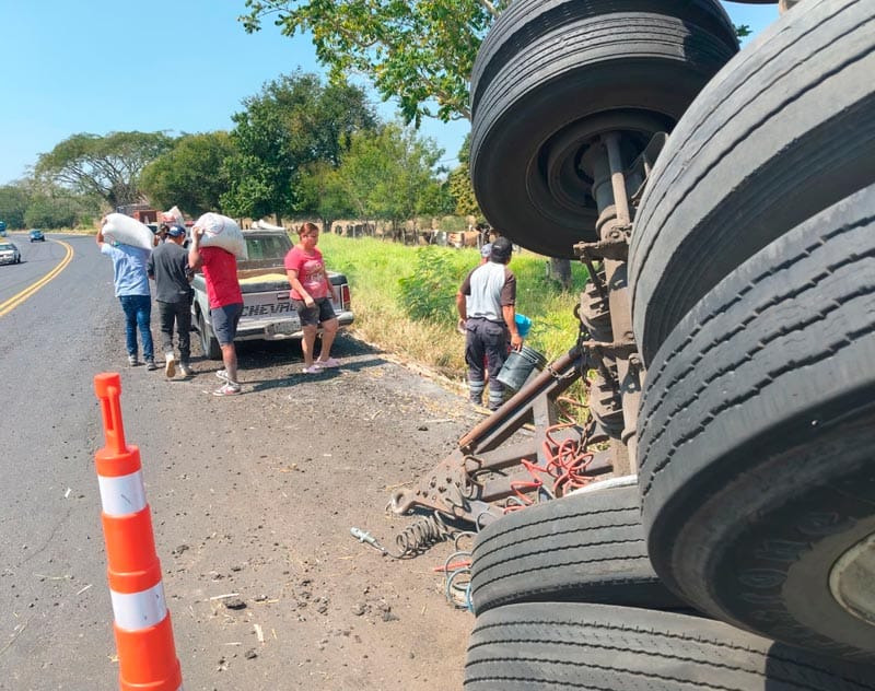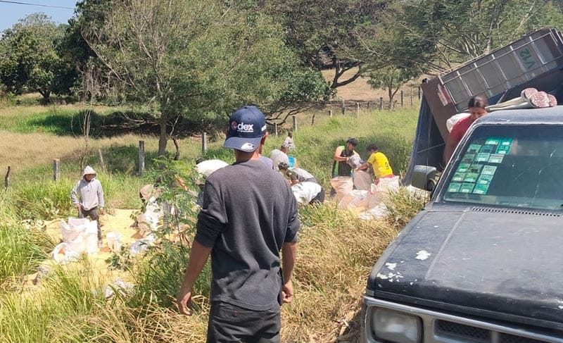 Como consecuencia, varias toneladas de grano quedaron esparcidas sobre el asfalto y el acotamiento y, en cuestión de minutos, habitantes de comunidades cercanas comenzaron a llegar al lugar para llevarse el producto.