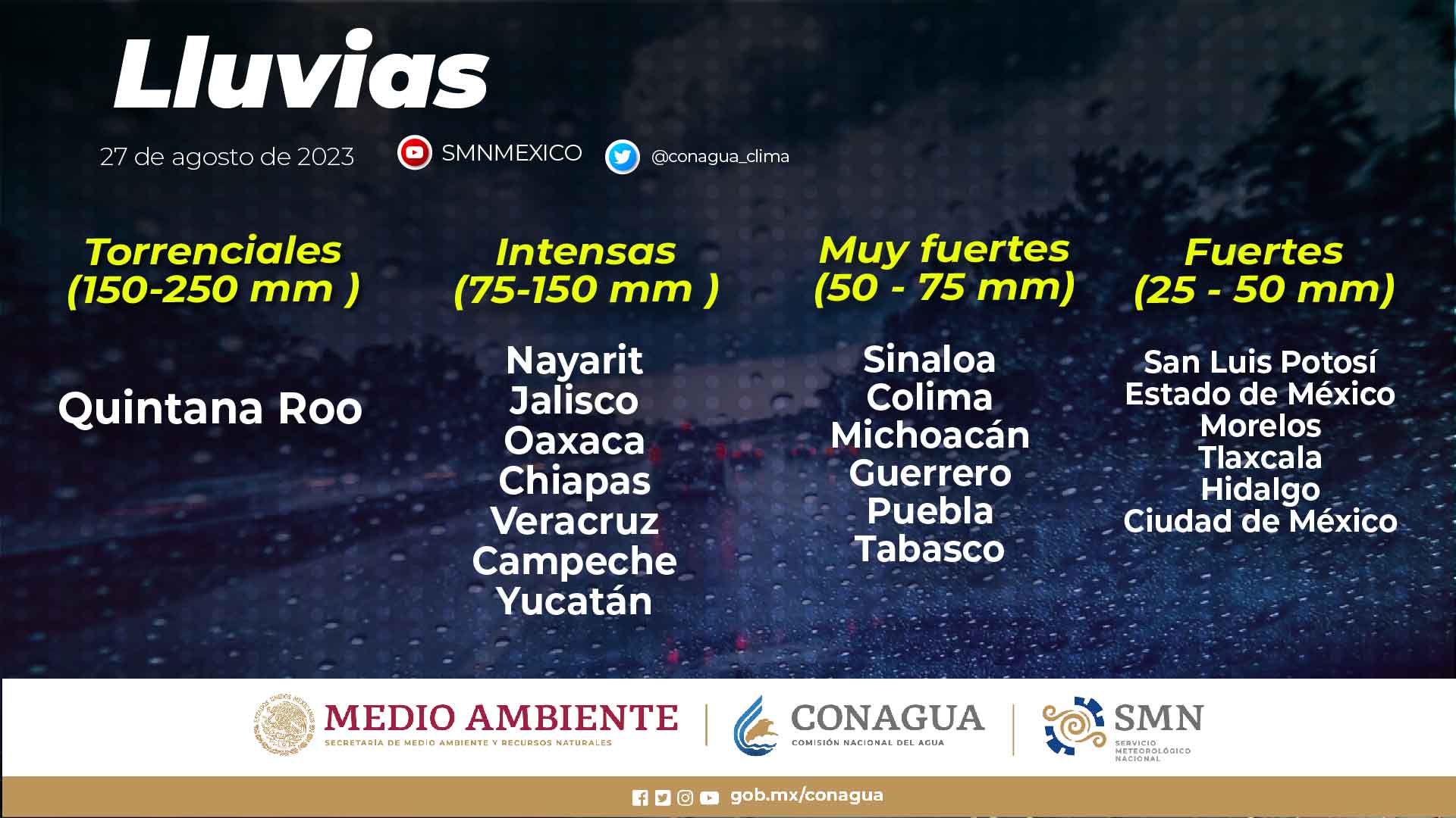 El Sistema Meteorológico Nacional ( SMN) informó que sus bandas nubosas mantendrán las condiciones para lluvias torrenciales (de 150 a 250 milímetros [mm]) en Quintana Roo; lluvias intensas (de 75 a 150 mm) en Campeche y Yucatán; rachas de viento de 70 a 90 km/h con oleaje de 2 a 4 metros de altura y condiciones para la formación de trombas en las costas de Quintana Roo y Yucatán.